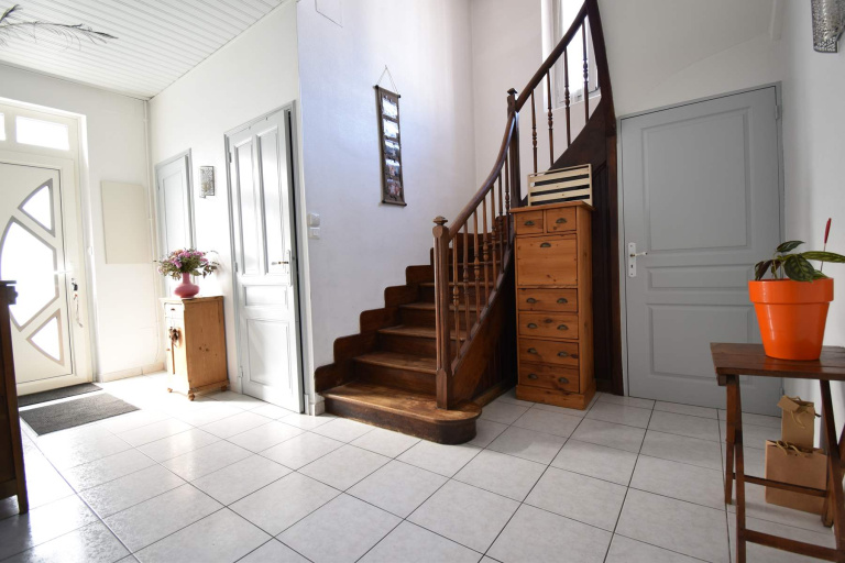 Elle comprend au rez-de-chaussée une entrée, une cuisine aménagée, un salon, une salle à manger, une véranda donnant sur une cour agréable et lumineuse, une salle d'eau (une douche, une vasque) et un wc. Au premier étage un palier, trois grandes chambres et une salle de bain (avec baignoire, double vasque, un wc, un placard). Au second étage, un palier, une grande chambre, et une partie grenier.