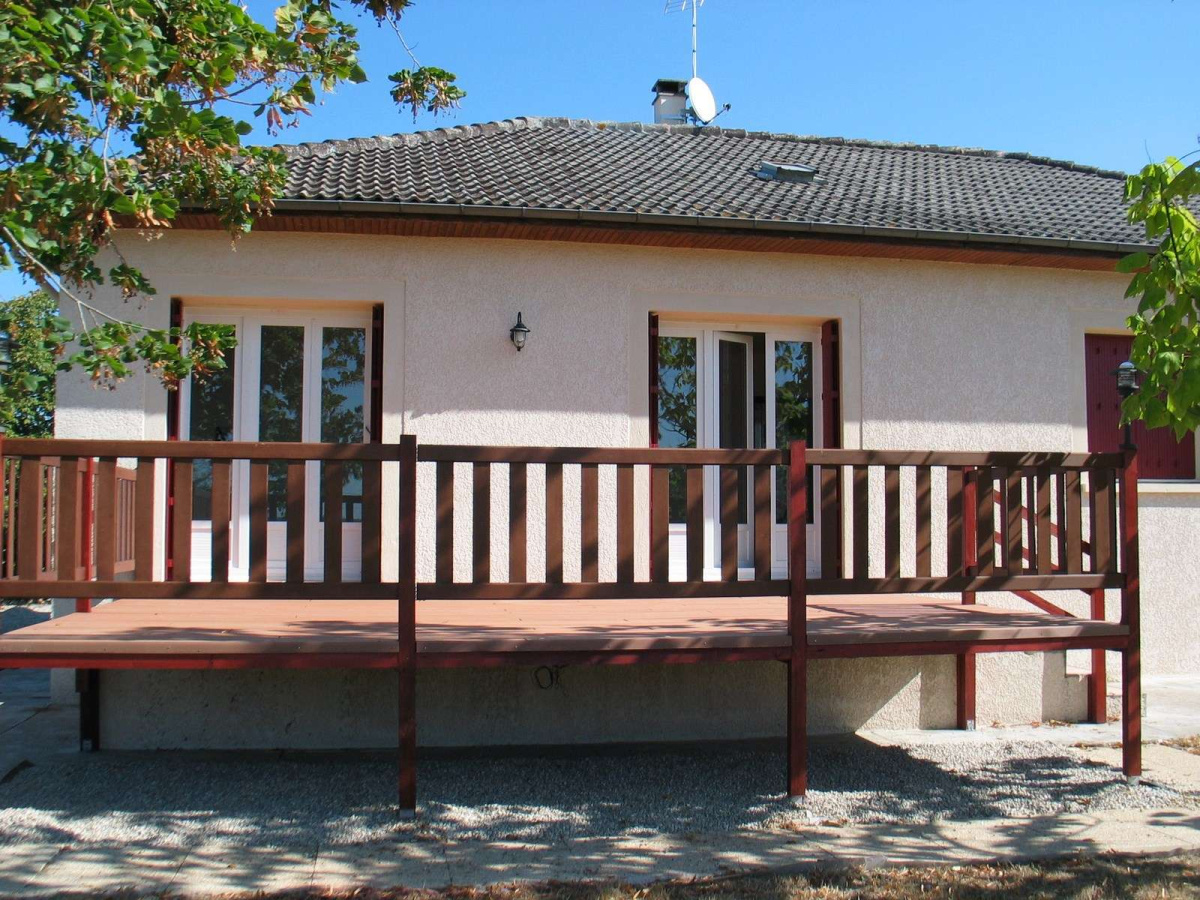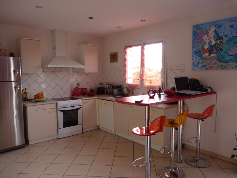Maison de plain pied de type 4, comprenant une pièce de vie, avec son coin cuisine aménagée, un hall nuit, trois chambres avec placard, une salle de bain, un wc, un cellier. Et un garage de 13 m² attenant.